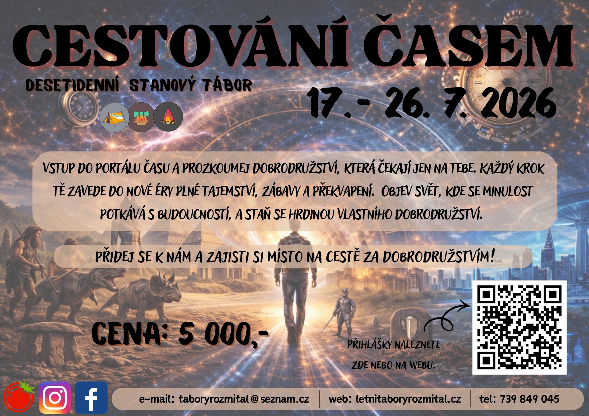 připravte si kufry a nastartujte stroj času, protože letošní letní tábor nás zavede na napínavou CESTU ČASEM! Od 17. července do 26. července se společně vydáme na desetidenní dobrodružství plné objevování, zábavy a výzev, během kterého procestujeme osm různých časových období. Každý den nás čeká jiná éra, od dávné minulosti až po vzdálenou budoucnost, kde poznáme život, zvyky i výzvy dané doby a jako skuteční cestovatelé časem budeme muset čelit nejrůznějším nástrahám. Přihlásit se mohou děti od 6 do 16 let, starší účastníci ve věku 17 let se mohou přihlásit jako "Adoři" a stát se součástí táborového týmu, díky čemuž si mohou vyzkoušet tábor z nové perspektivy.